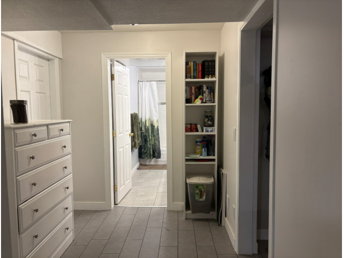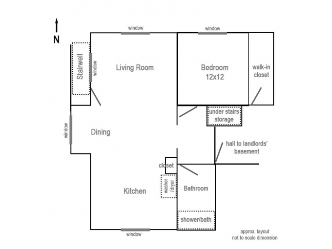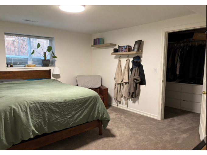 800sqft Basement Suite, one-bedroom with "great room" living/dining/kitchen, full bathroom, and large walk-in closet / storage room. Great for a couple, single, or pair willing to share the bedroom. Unfurnished (the photos were taken by current tenants, still living there). With lots of windows! Separate entrance around back of house down a set of stairs.