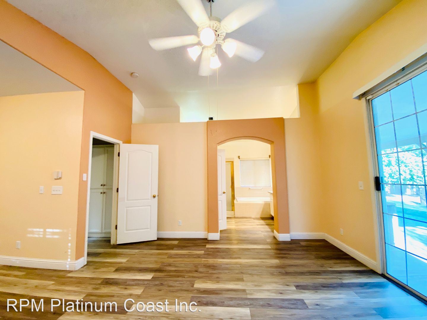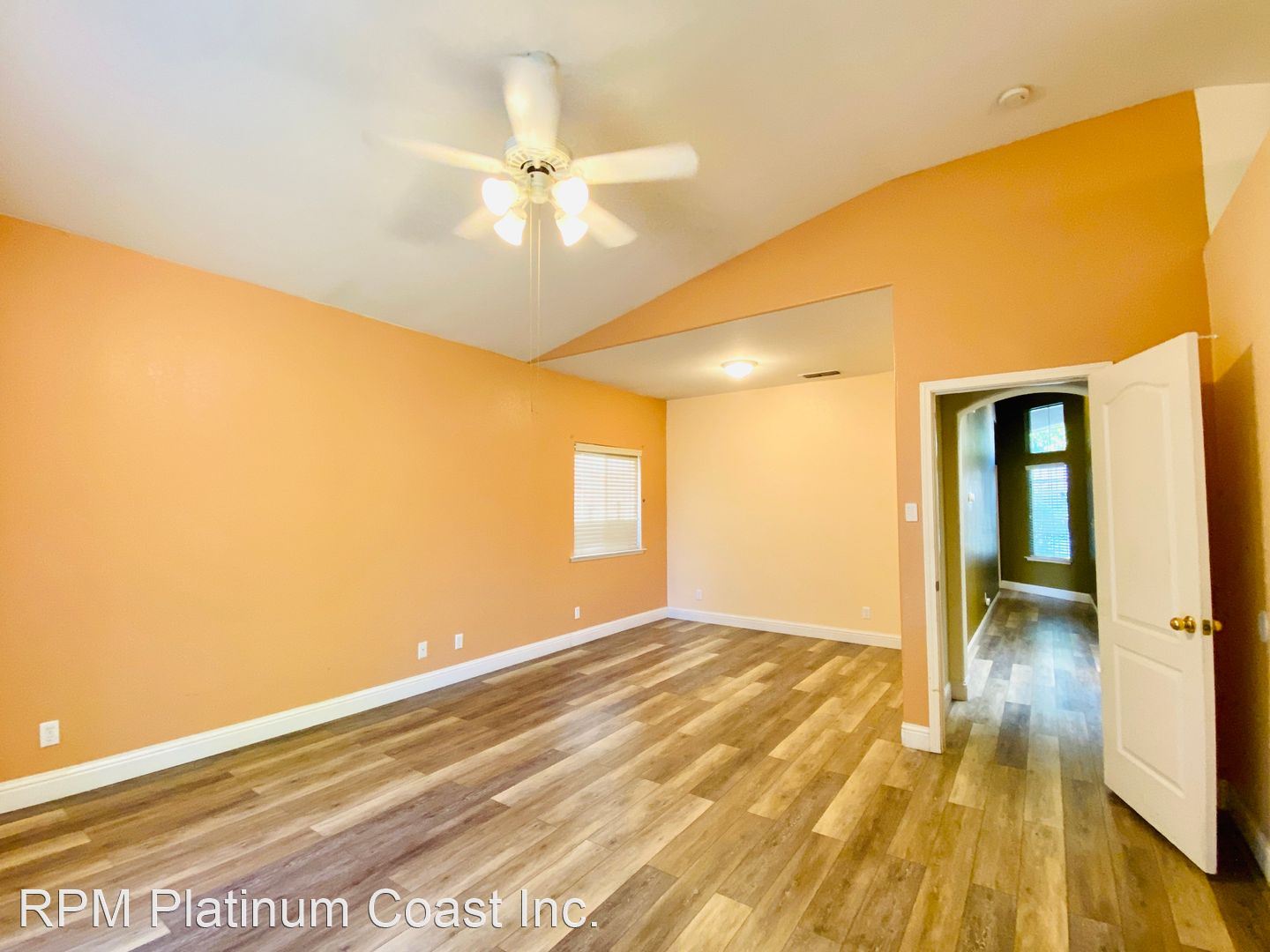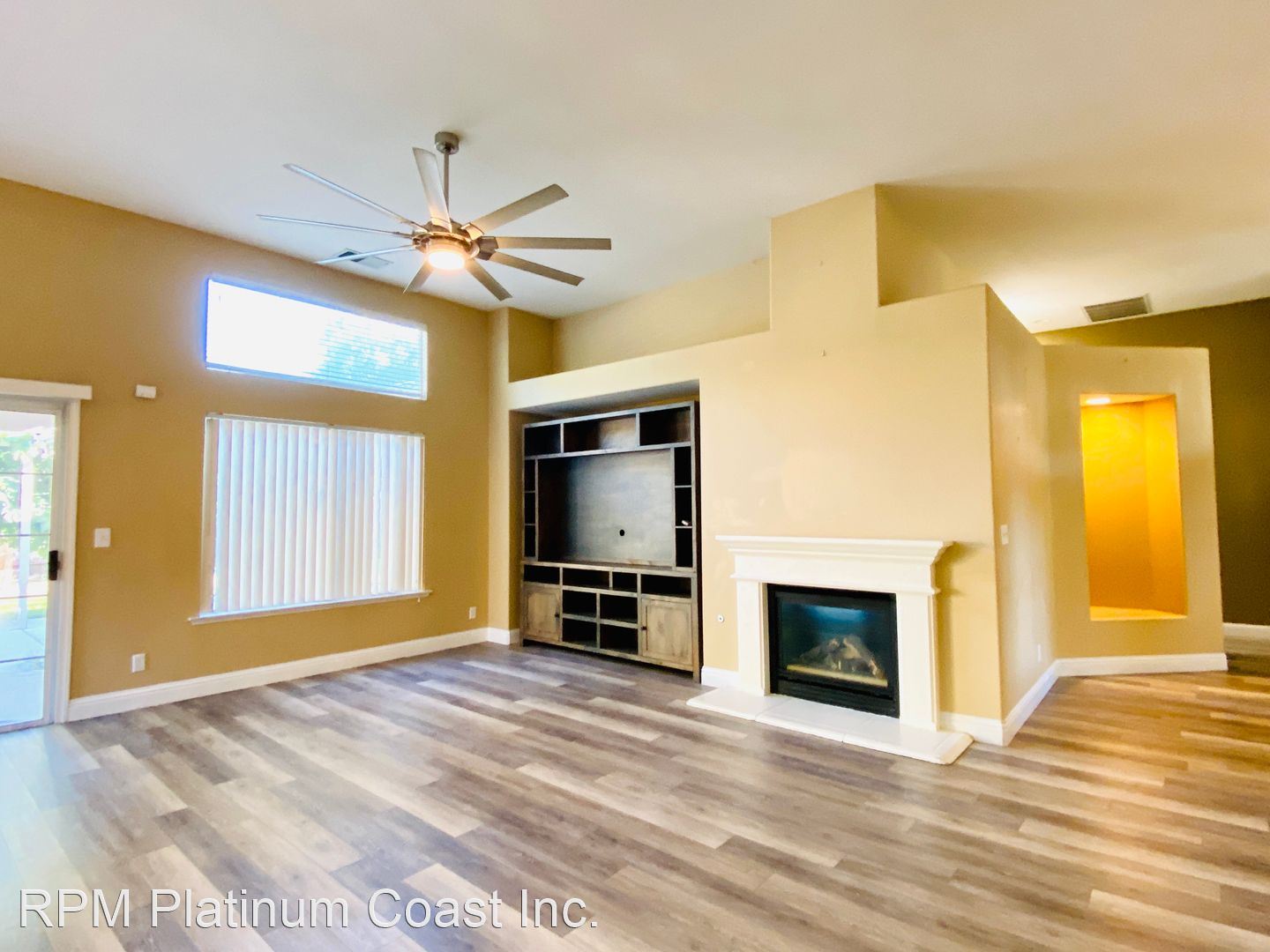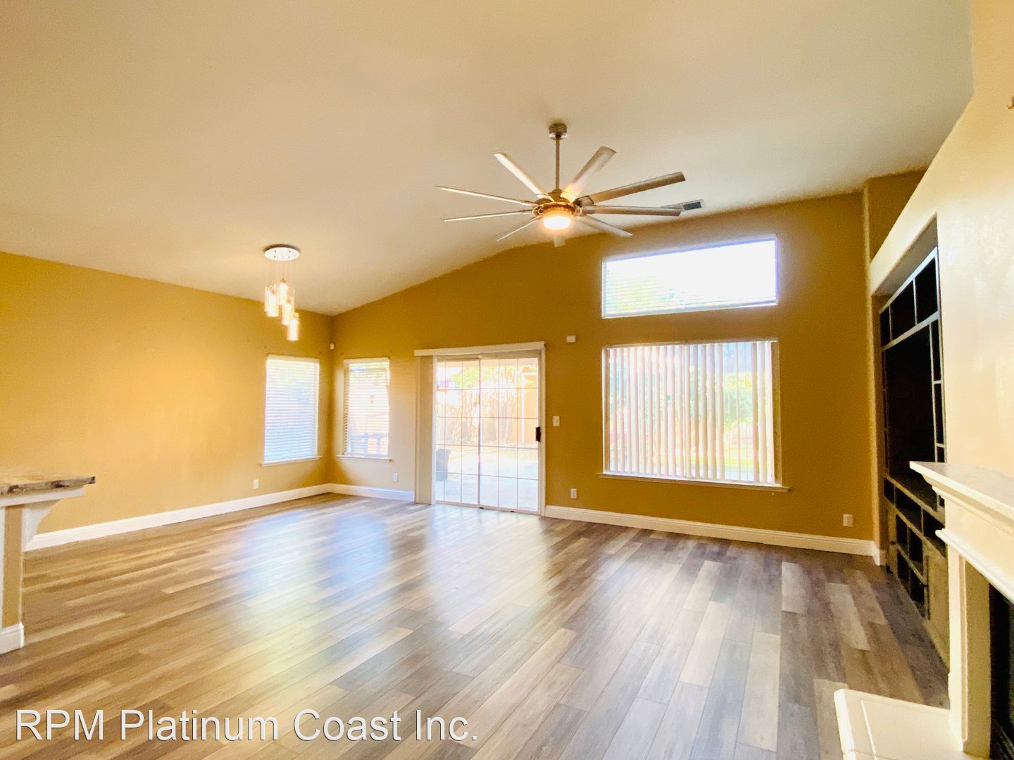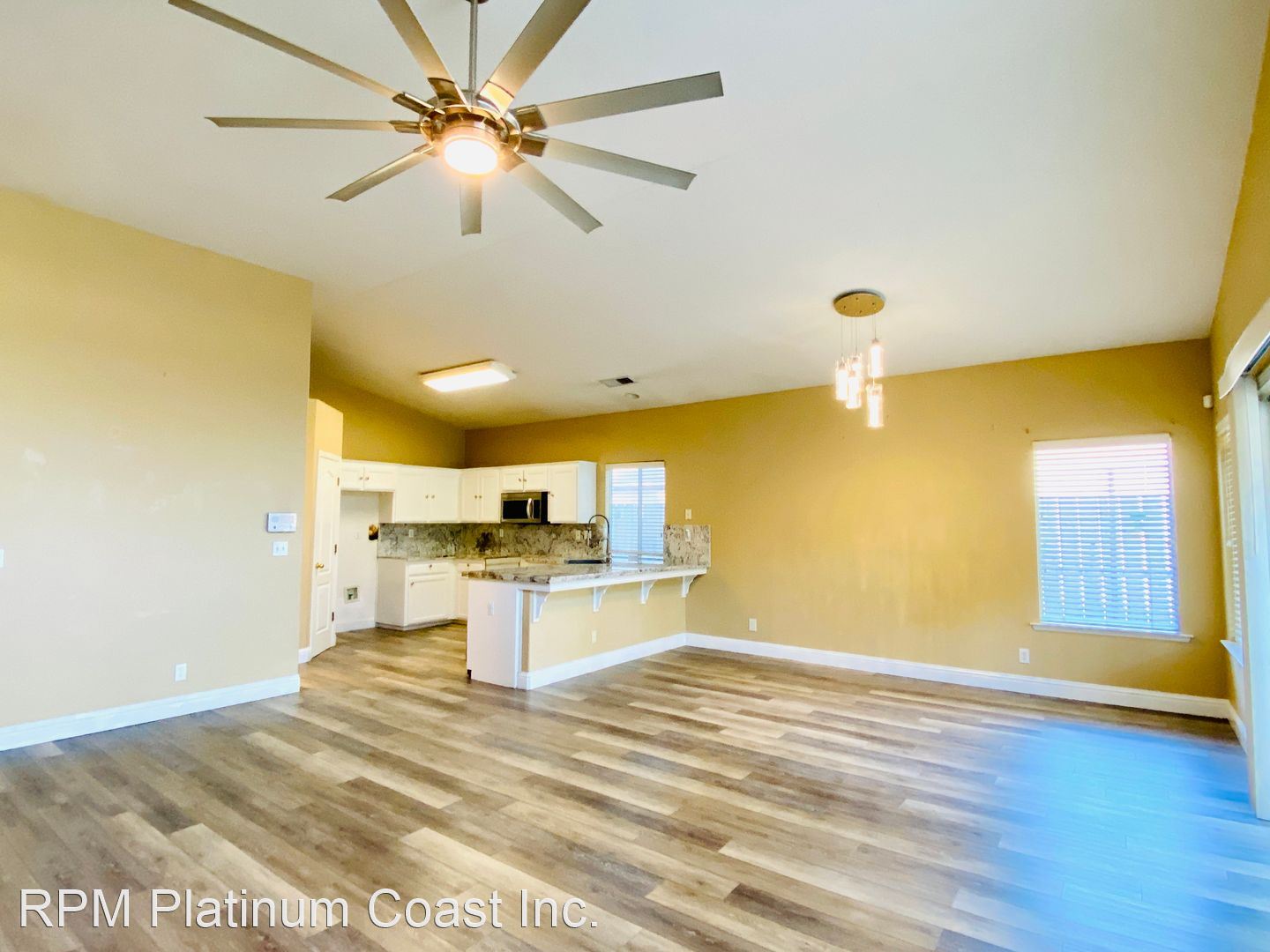 Great room has a large remote ceiling fan and great windows and sliding door for natural light.