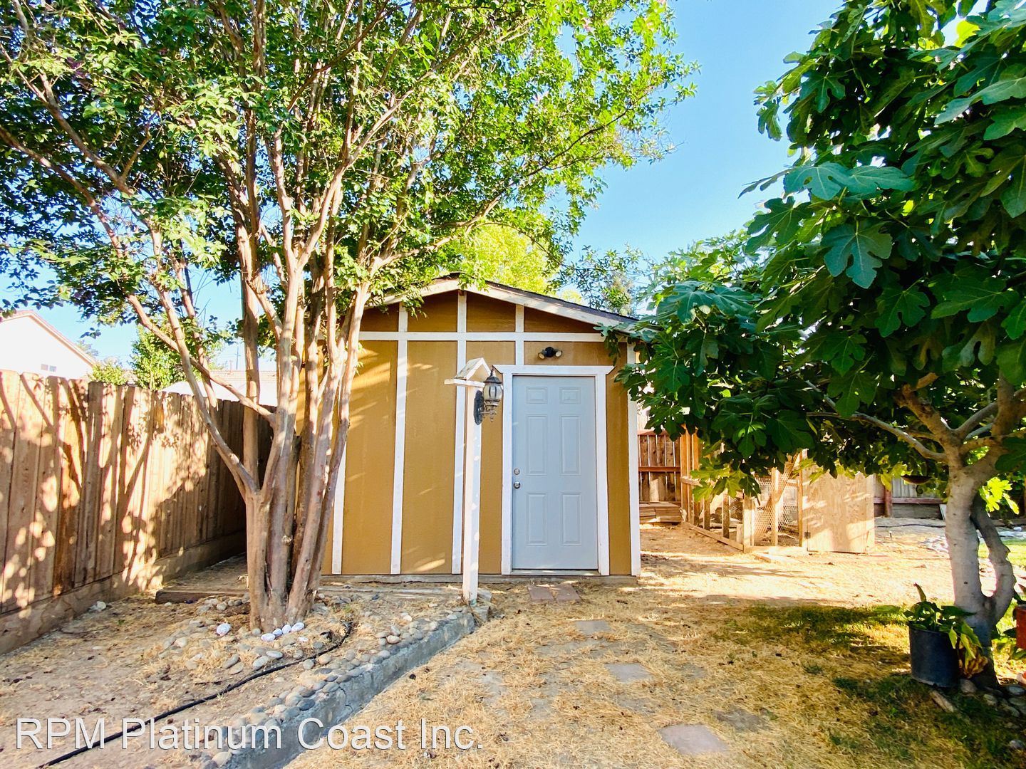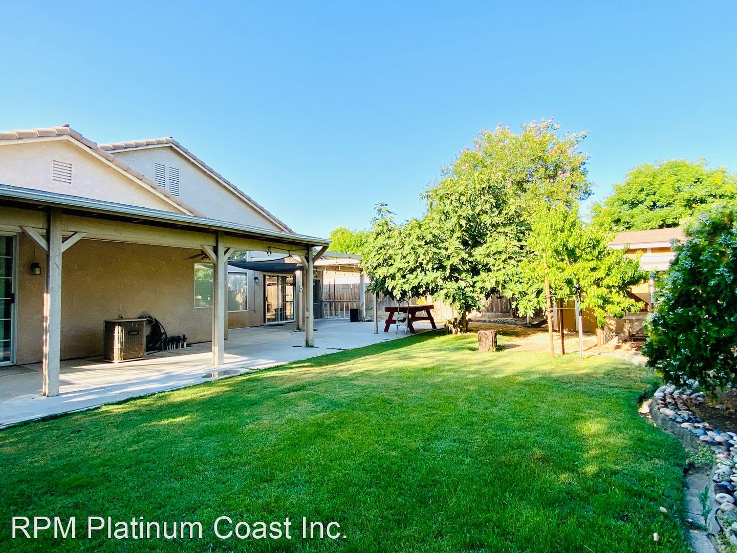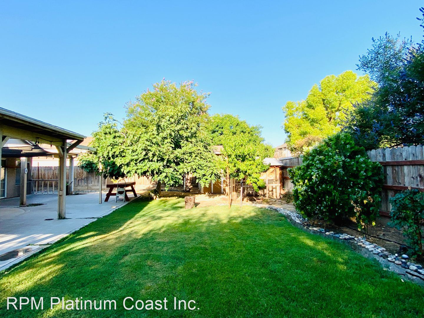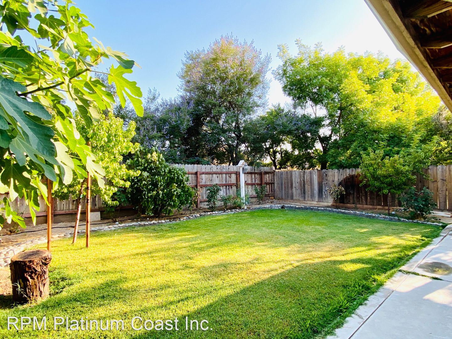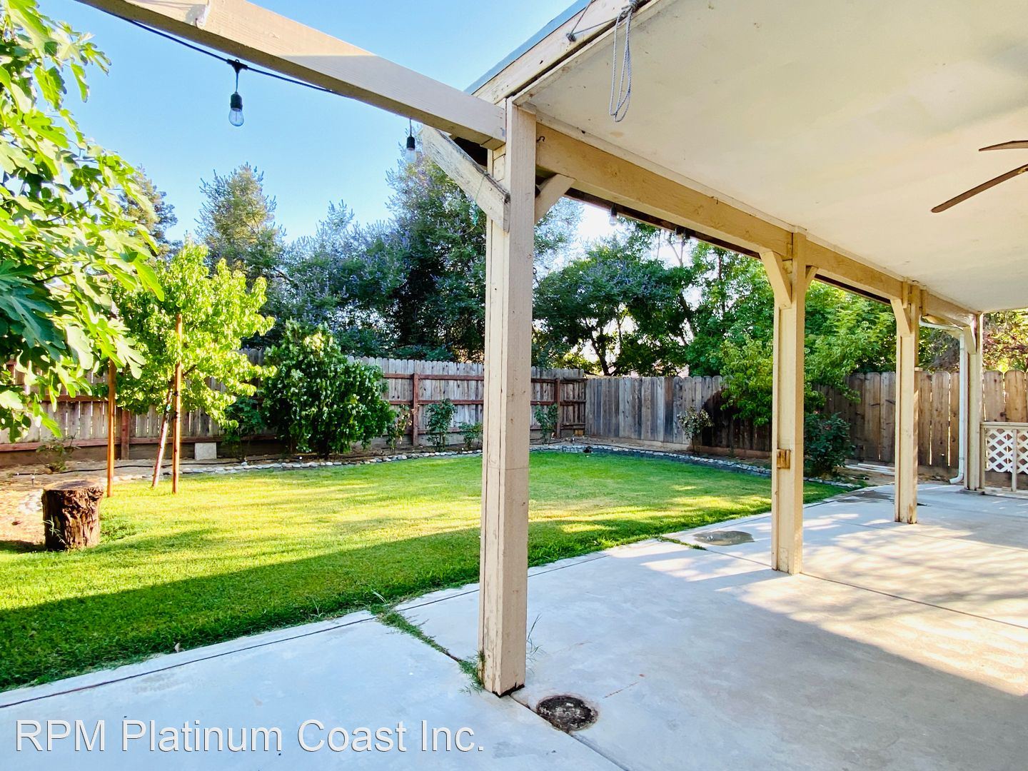 Backyard has large covered patio with ceiling fans. Backyard is beautifully landscaped with fruit trees including lemon, fig, guava, and nectarines.