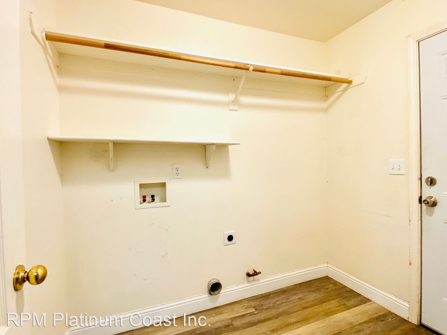 Interior laundry with gas and electric hookups and shelves.